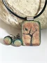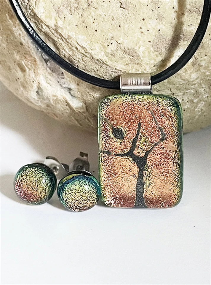 Réz és zöld színben váltakozó életfa üvegmedál pötyi fülivel. Mérete: 2,6 x 2,7 cm. Kézműves ékszerszett.
