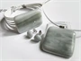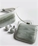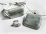 Halvány szürke üvegékszer szett fülivel, medállal és karkötővel. Medál mérete: 3,6 x 3,3 cm. Kari: 2,6 x 3,7 cm. Pötyi fülivel.
