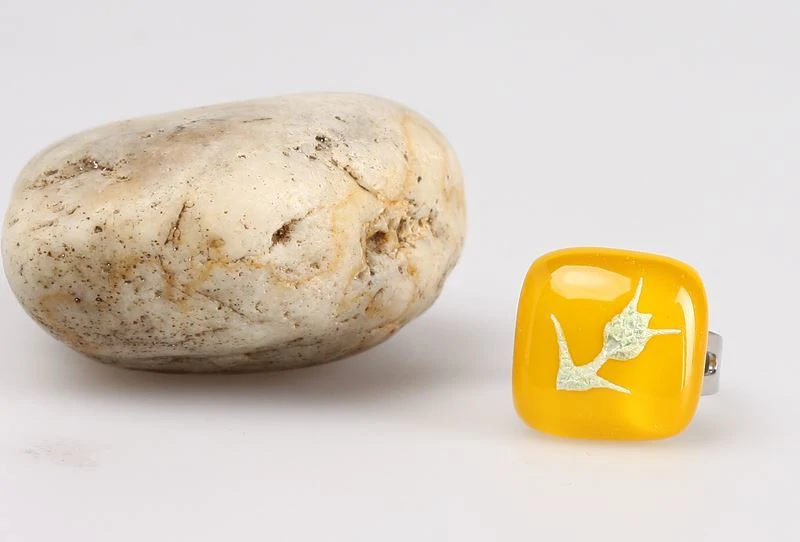 Fusing technikával készült üvegékszer gyűrű tulipánnal. A gyűrű mérete állítható, kb. 17-21 mm-ig.